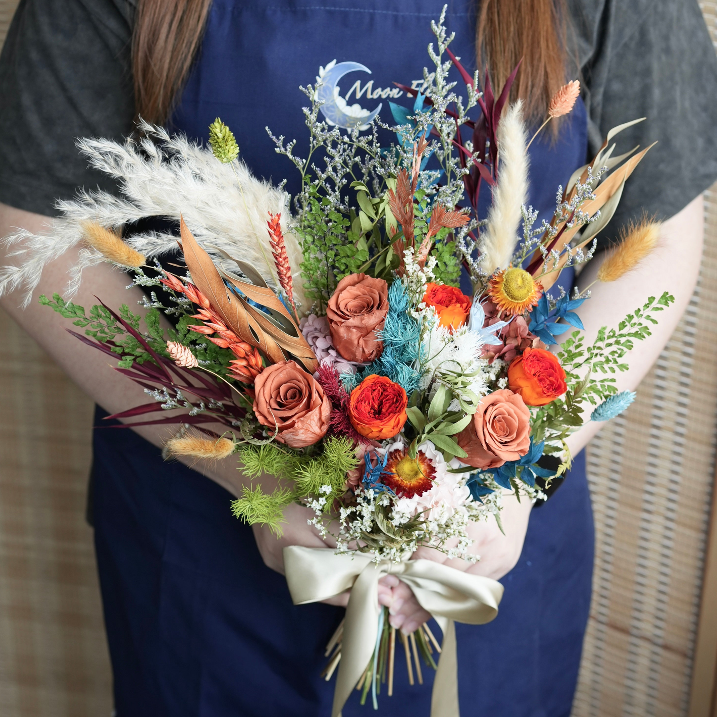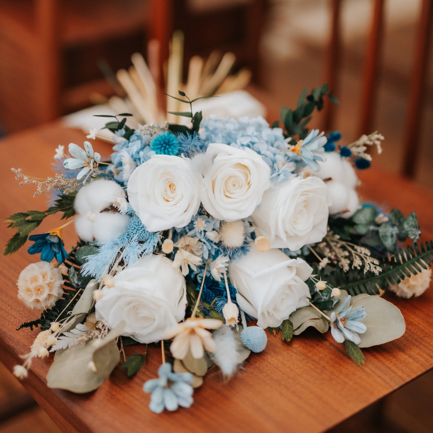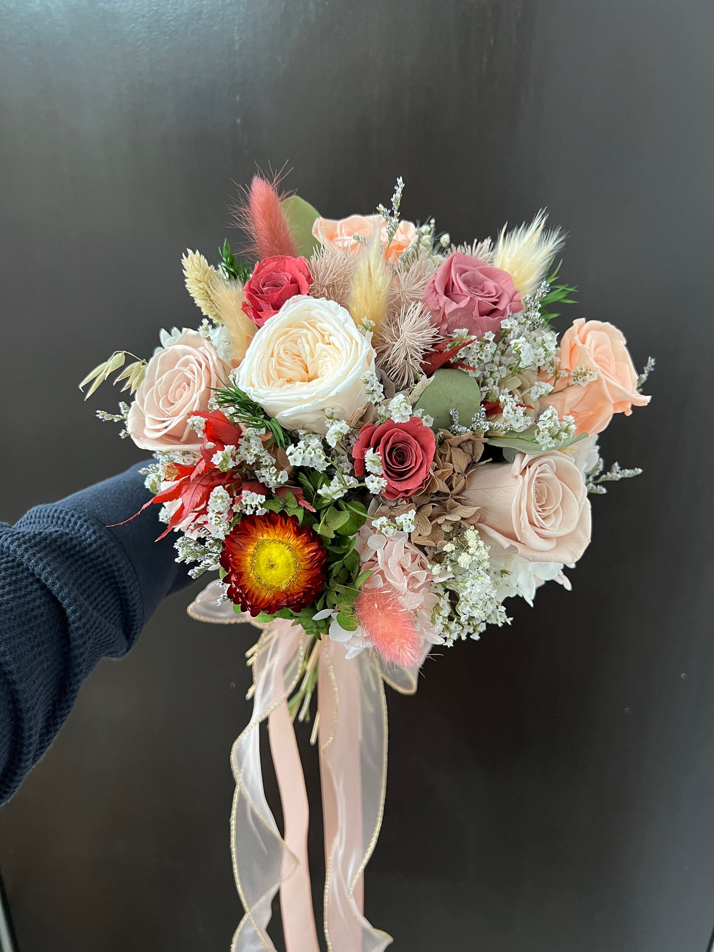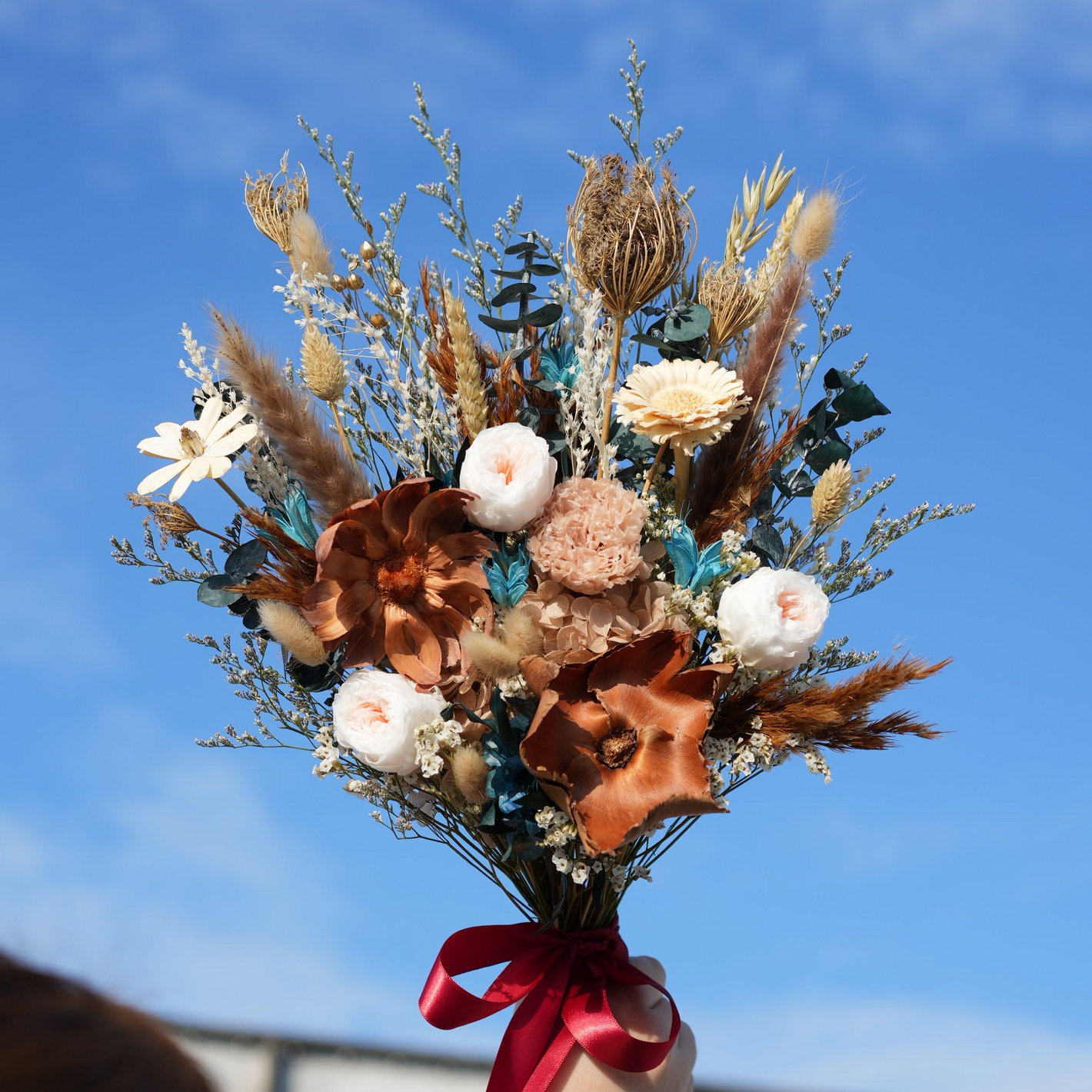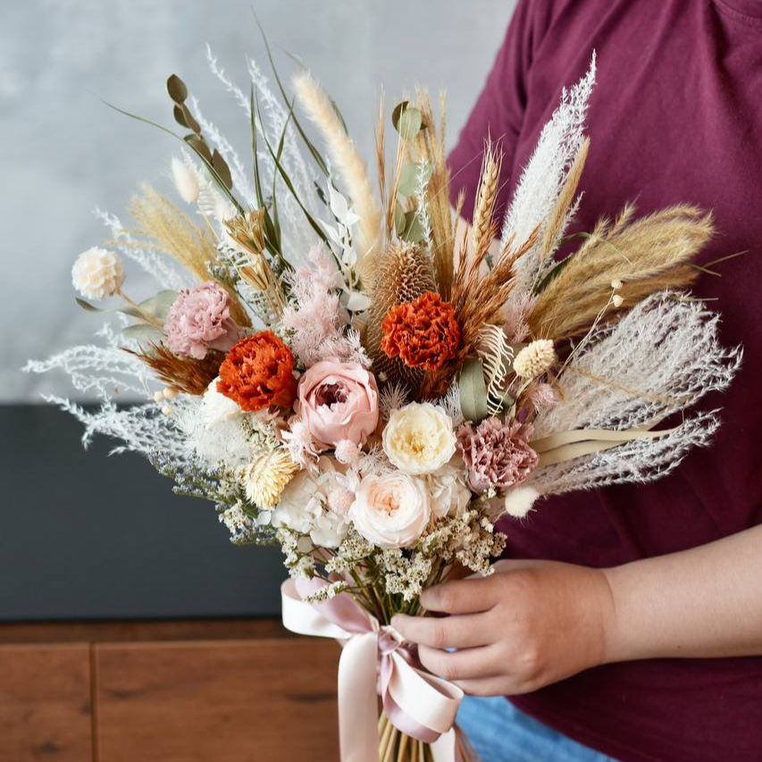 Our handheld bridal bouquets, crafted from dried and preserved flowers, designed to suit your size, style and wedding theme.
