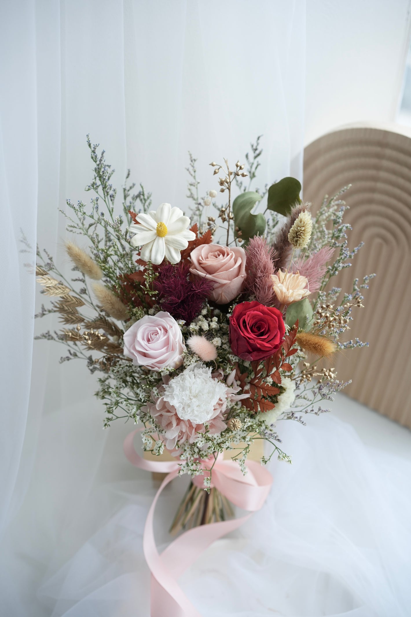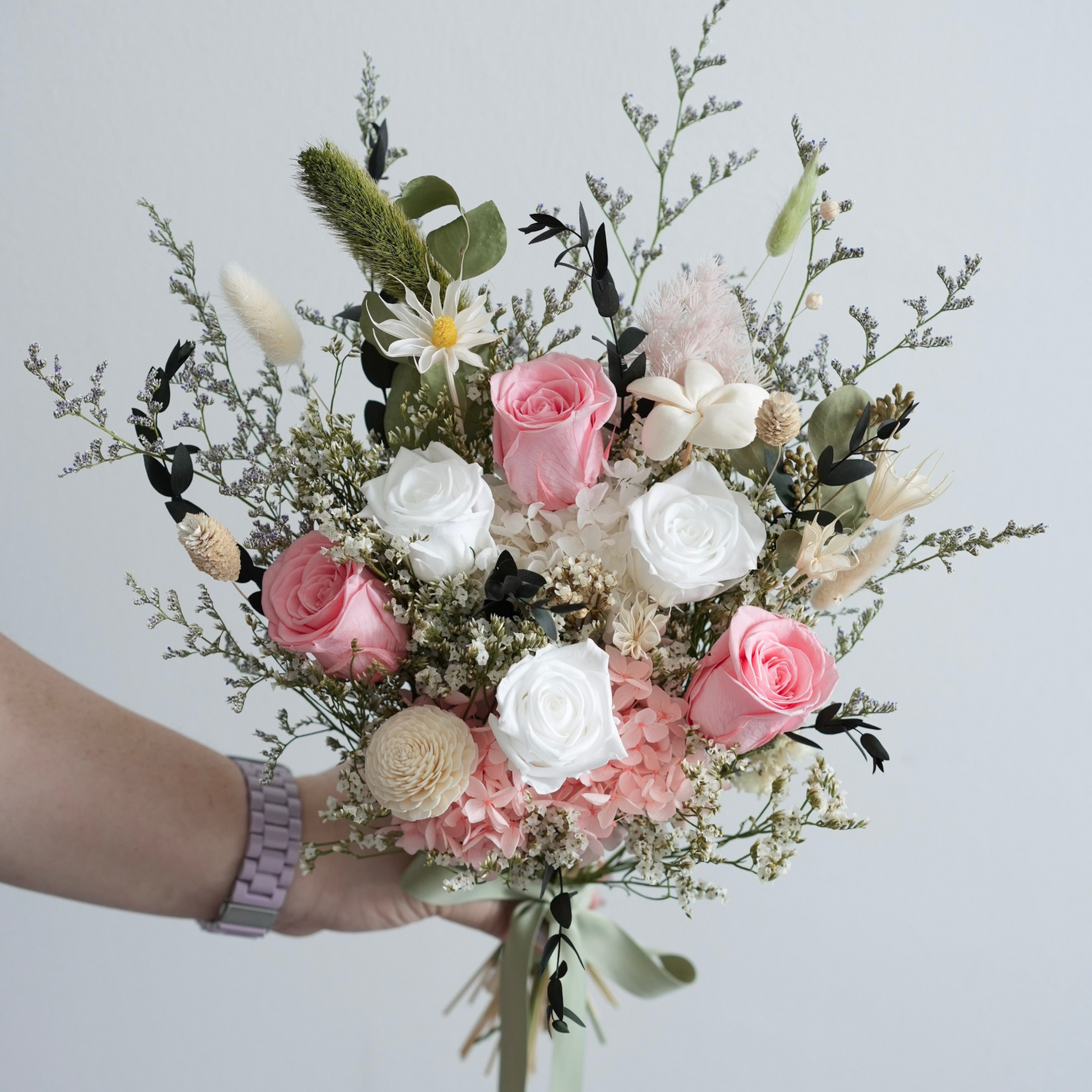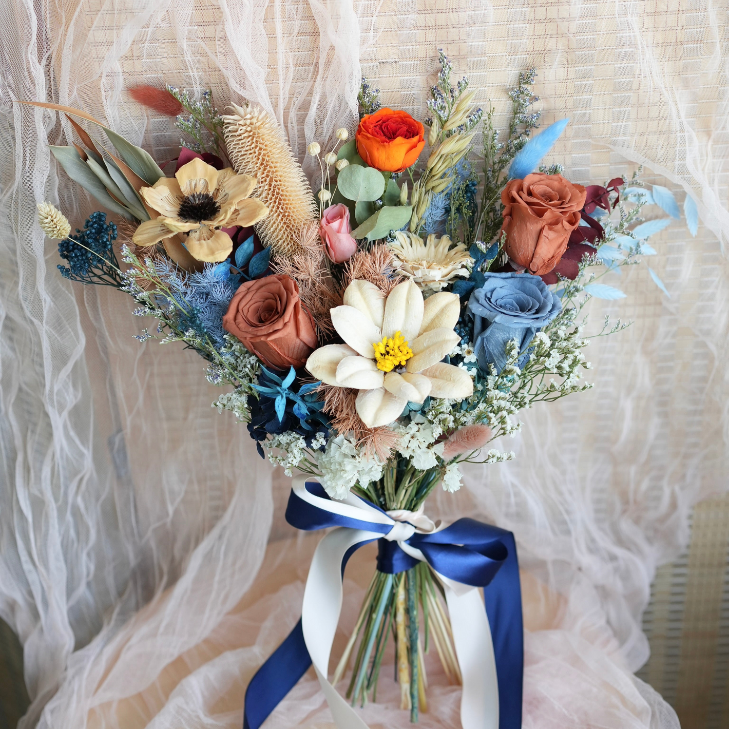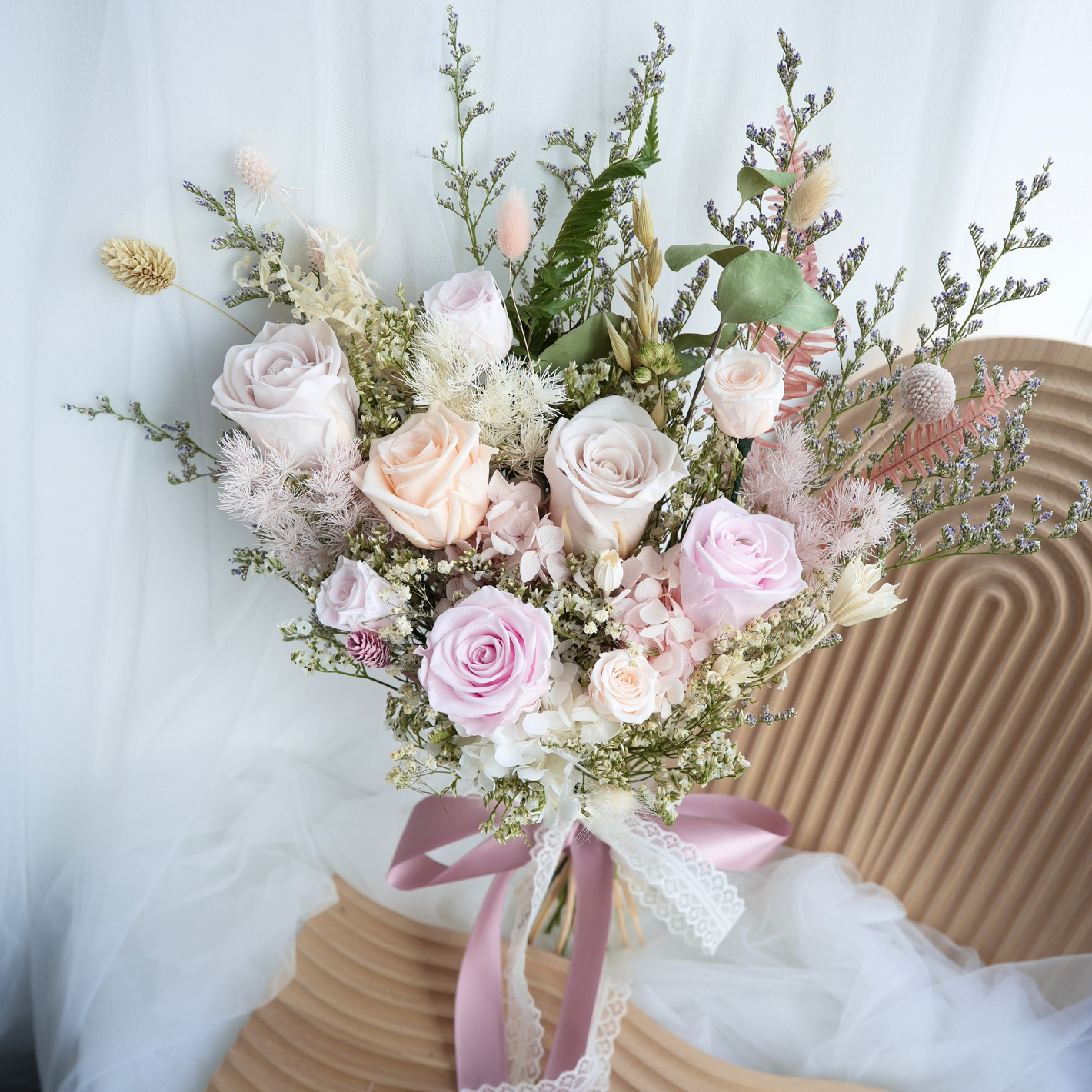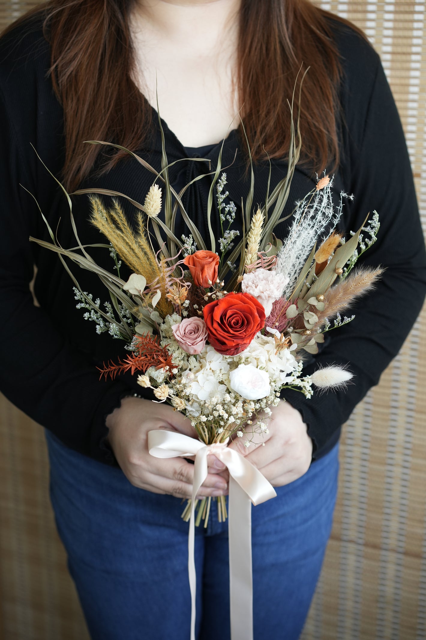 Our handheld bridal bouquets, crafted from dried and preserved flowers, designed to suit your size, style and wedding theme.