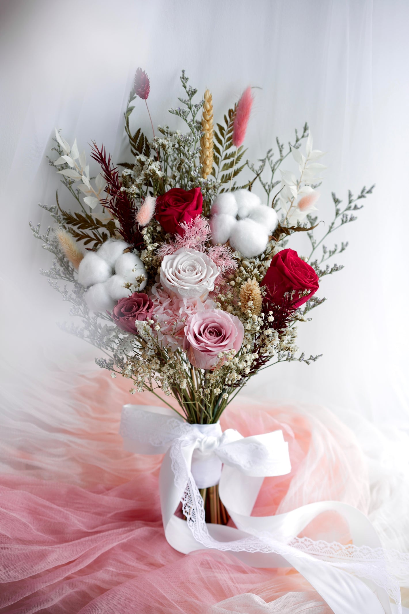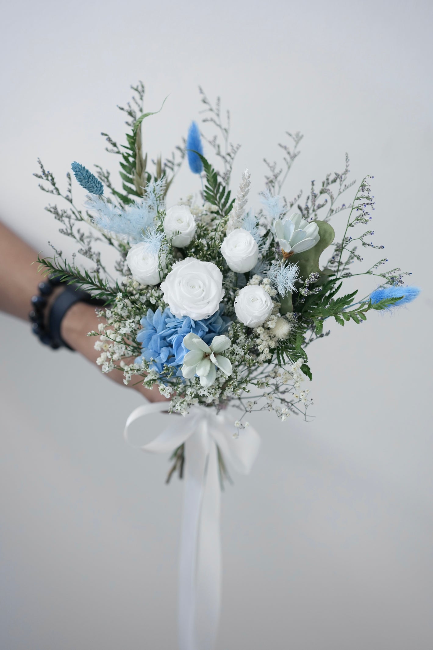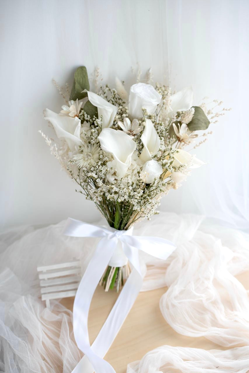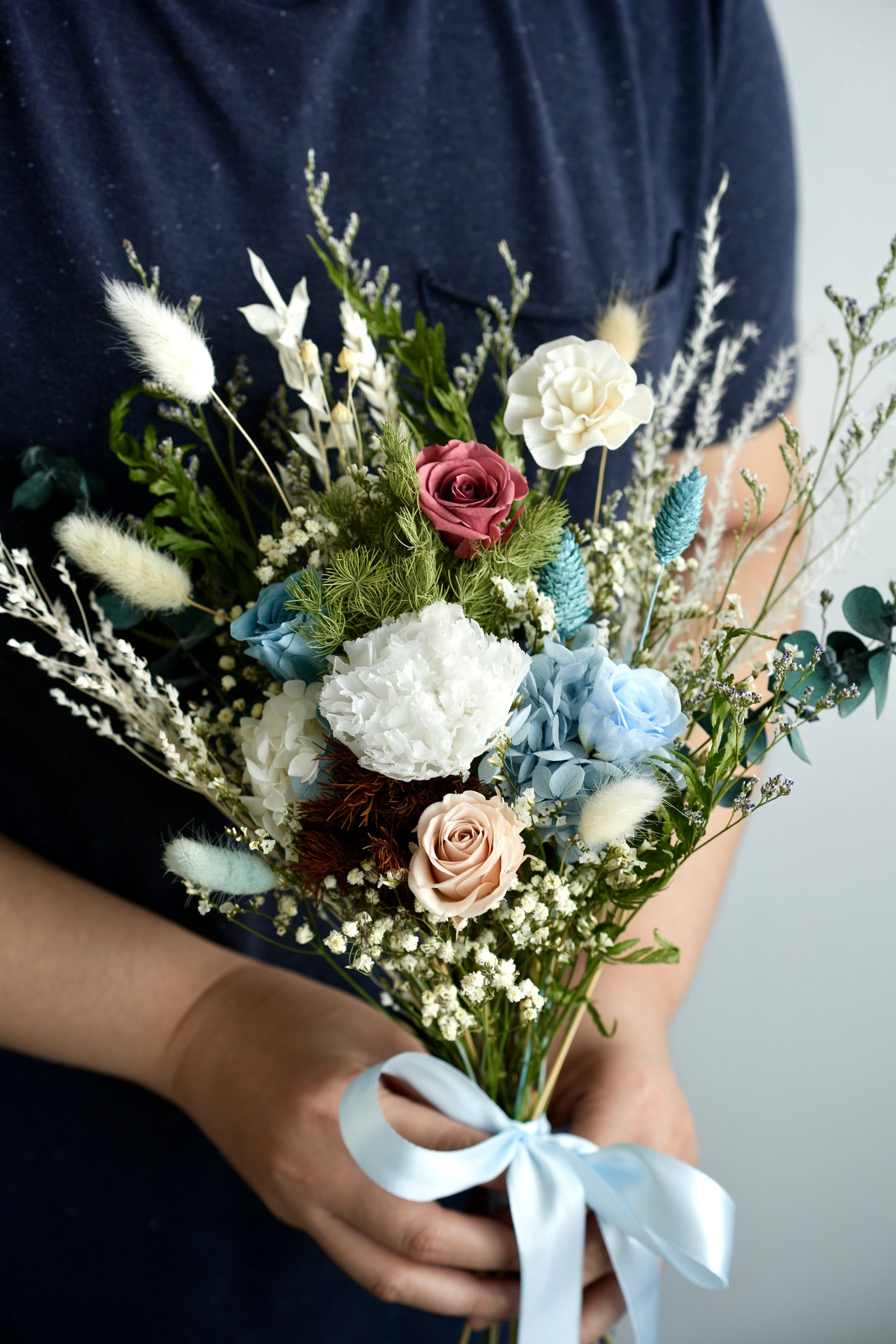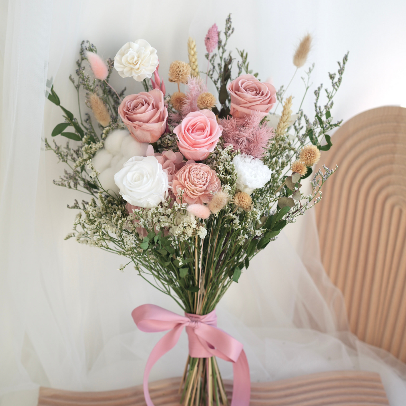 Our handheld bridal bouquets, crafted from dried and preserved flowers, designed to suit your size, style and wedding theme.