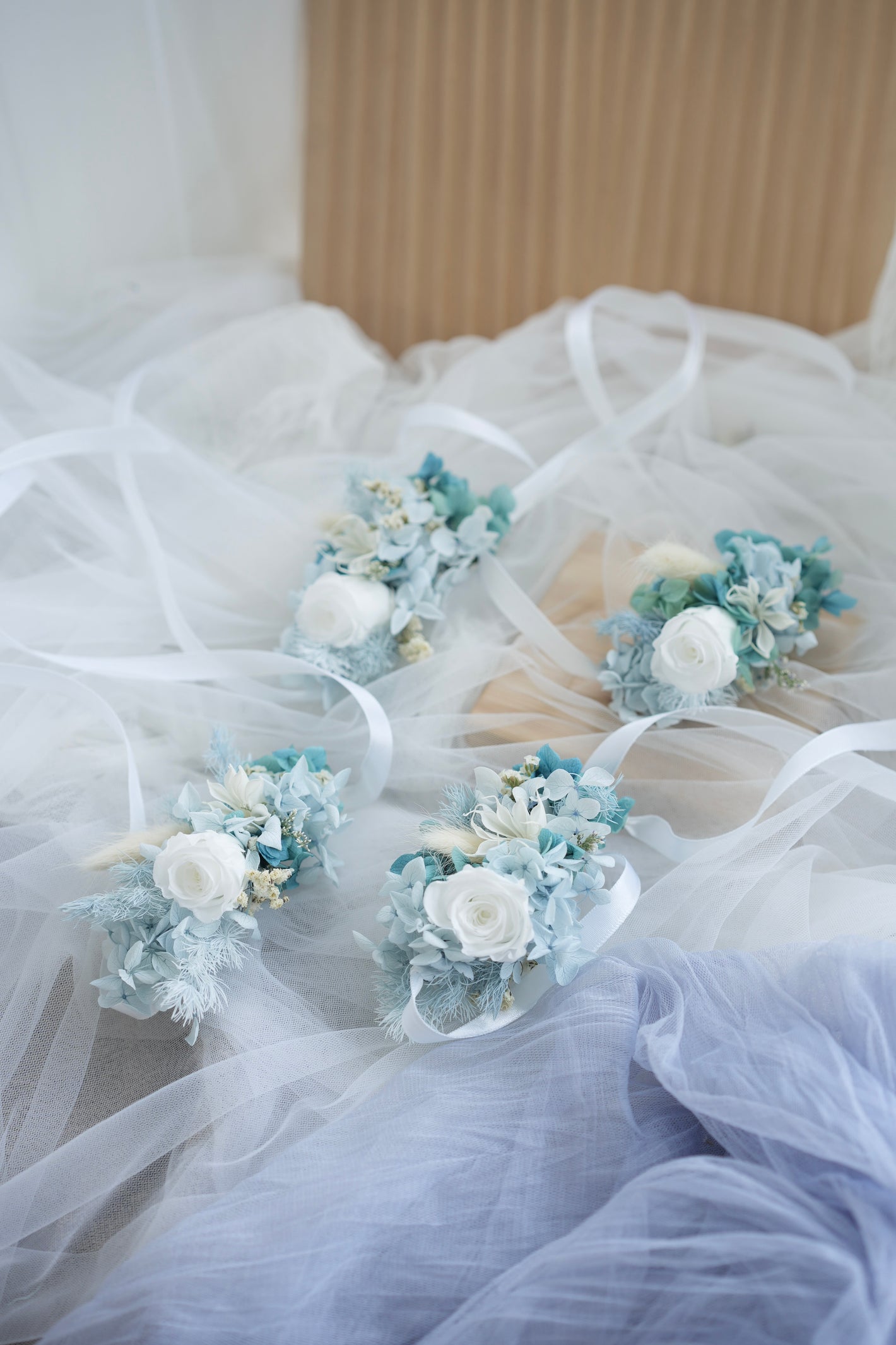 Designed and curated to complement your bridal party's look, boutonnieres for the groom, boutonnieres and corsages for the entourages.