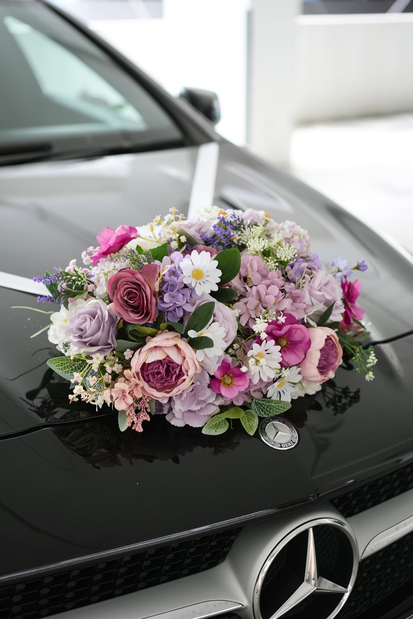 Enhance your bridal car with our exquisite decorations, featuring realistic faux flowers that last through rain or shine and, most importantly, throughout your wedding celebration! Each car decoration is custom-designed to complement your wedding theme on your special day. Our standard package includes a floral centrepiece and floral door posies.