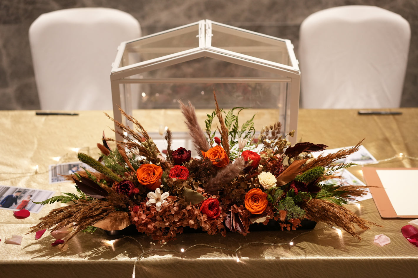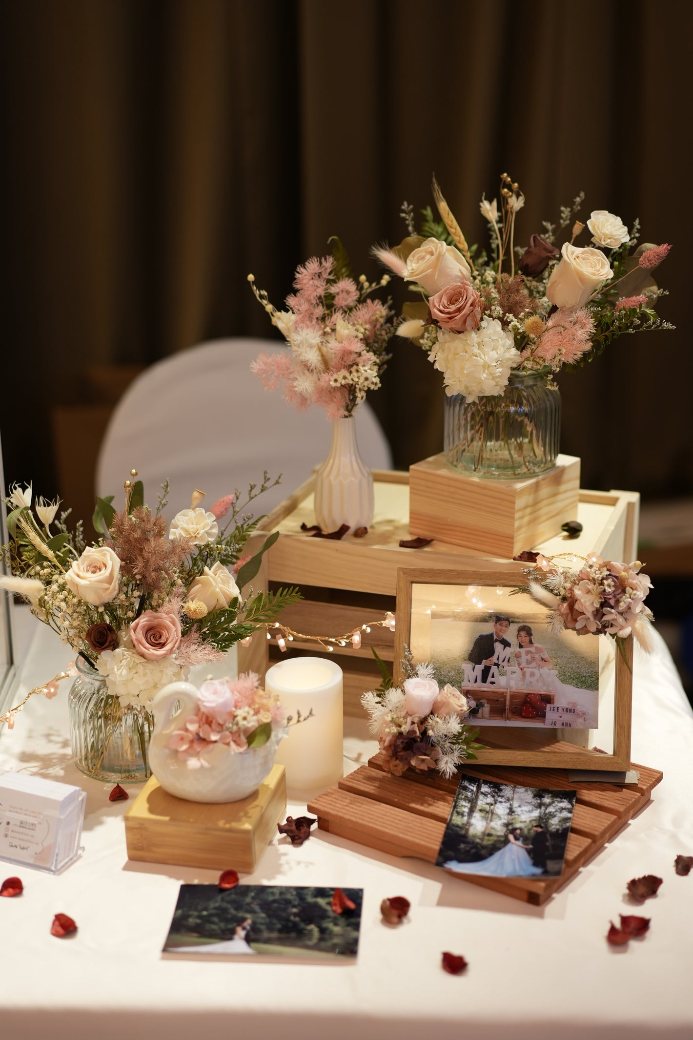 The reception table is where your guests gather to share in the celebration, so it's essential to create a welcoming and festive atmosphere. Our reception table flower styling combines elegance and creativity, with beautiful floral centrepieces that elevate that overall look of your venue. Using artificial and preserved flowers, we design arrangements that lasts through the day, ensuring your reception table look fresh and inviting from the moment your guests arrive!