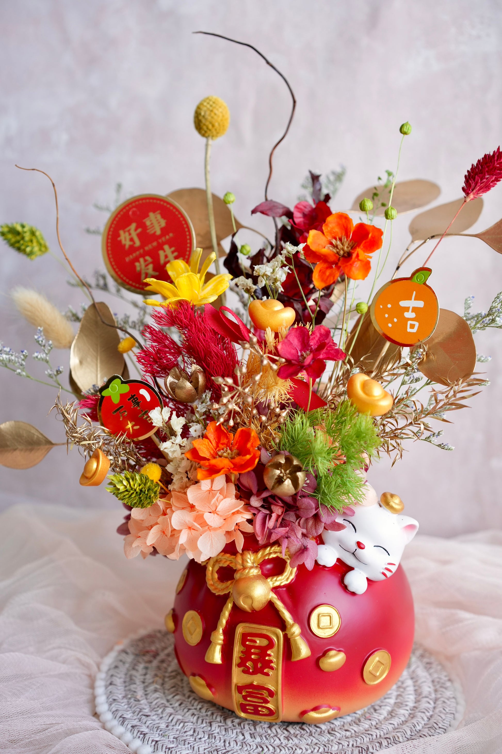 Like a wish come true at midnight, this arrangement bursts with vibrant florals and golden accents. Each petal is a promise of sudden luck and new beginnings. Inspired by the dream of 一夜暴富, it brings a touch of magic and hope, inviting prosperity to blossom swiftly in your home.